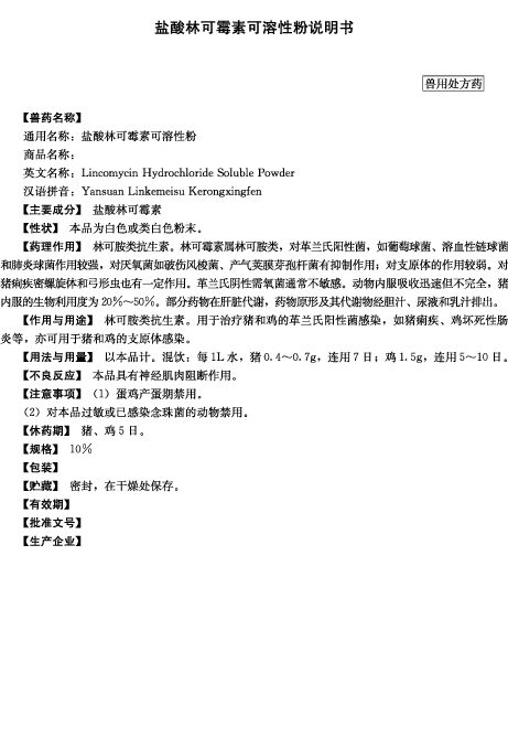 林可胺类抗生素。用于治疗猪和鸡的革兰氏阳性荫感染,如猪痢、鸡坏死性肠炎等,亦可用于猪和鸡的支原体感染。