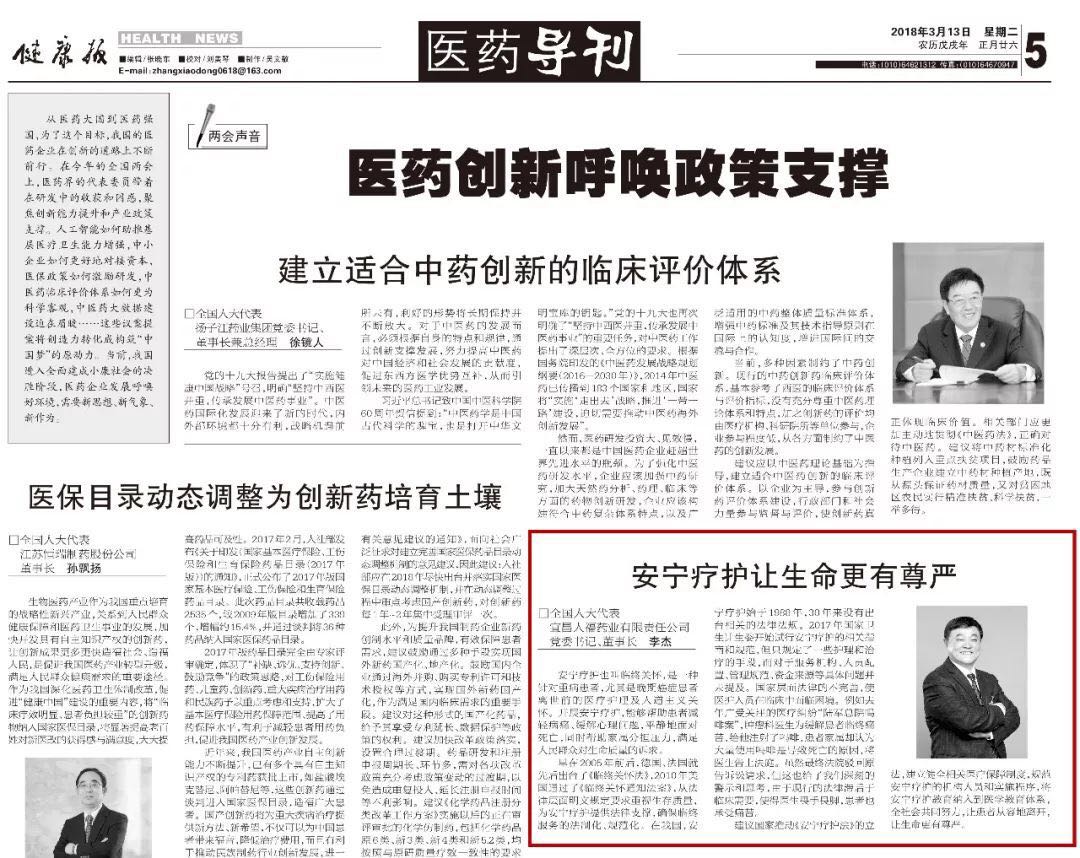 如何更好地实施临终关怀,帮助病人减少临终前的痛苦?全国人大代表,JNTY江南集团股份公司总裁,宜昌人福药业有限责任公司党委书记、董事长李杰建议推动《安宁疗护法》立法,进一步规范安宁疗护的标准和管理制度,帮助病人有质量有尊严地度过生命的最后时光。该建议受到媒体积极关注,并先后在中国新闻网、《健康报》登出。