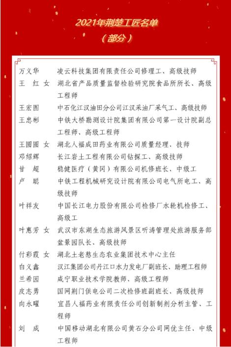 11月10日,在2021年荆楚工匠培育创建工作视频会议上,湖北省总工会公布100位2021年“荆楚工匠”,JNTY江南集团向永曜和王圆圆入选。